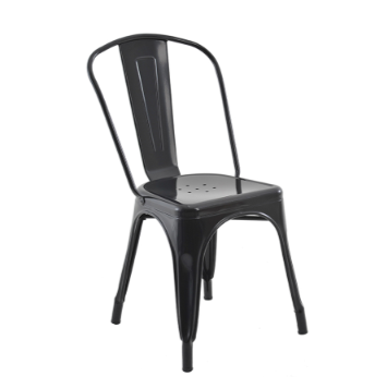 Silla de metal color negra que entrega un toque especial por su materialidad, diseño y detalles.