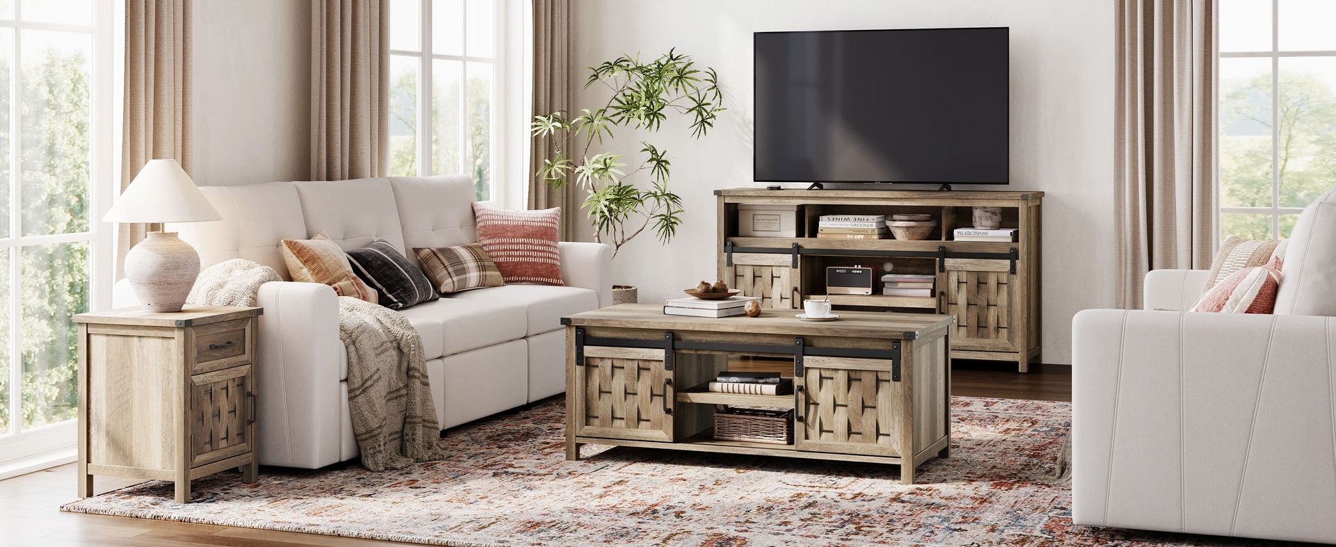 Descripción: La mesa de centro Vinh café combina un diseño rústico con toques modernos, convirtiéndose en el punto focal de tu sala de estar. Su acabado en madera con patrones entretejidos y detalles metálicos en los bordes aportan carácter y calidez. Las dos puertas correderas permiten un acceso fácil a los compartimentos, cada uno con estantes ajustables para adaptarse a tus necesidades. Los orificios para cables mantienen el orden, mientras los niveladores ajustables aseguran estabilidad en cualquier superficie. Fabricada con tablero de partículas P2 y MDF laminado, esta mesa ofrece una robustez excepcional.